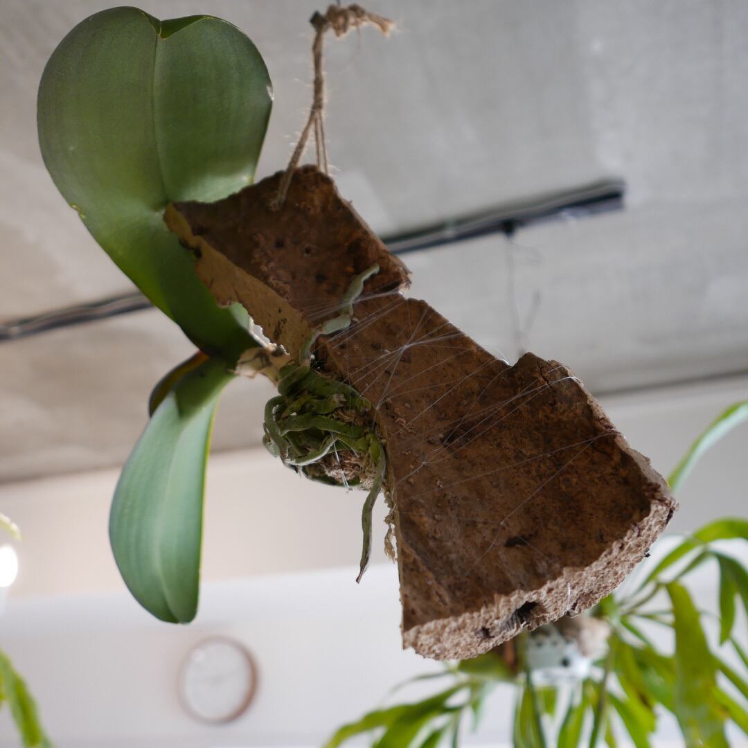 大きめの原生コルクに苔玉をつけてテグスで固定しています。